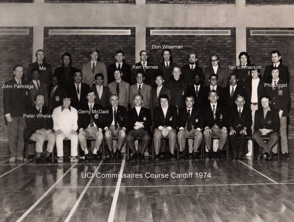 In 1974 I was one of the attendees at a Union Cycliste International (UCI) Commissaires course.  It was held in Cardiff and lasted a full week. My good friend Gerry McDaid had already qualified as an International  Commissaire at a previous course and was one of the instructors. We spent a full week learning and interpreting the then UCI rules and regulations for all the disciplines then in being (no mountain biking then!). Tests were held at the end of the week and I believe all students passed at one of the three levels. I just missed qualifying for Grade 1 (which entitled the Commissaire to takes charge of World and Olympic events) and had to settle for grade 2. It was difficult for me to undertake overseas appointments as my business was in full swing and required my attention so I was limited to UK events which included one of Mike Barrett’s  Tour of Britain events in the late seventies, a couple of visits to the Isle of Man for the Manx International run by Curwen Clague, and various city centre pro races.